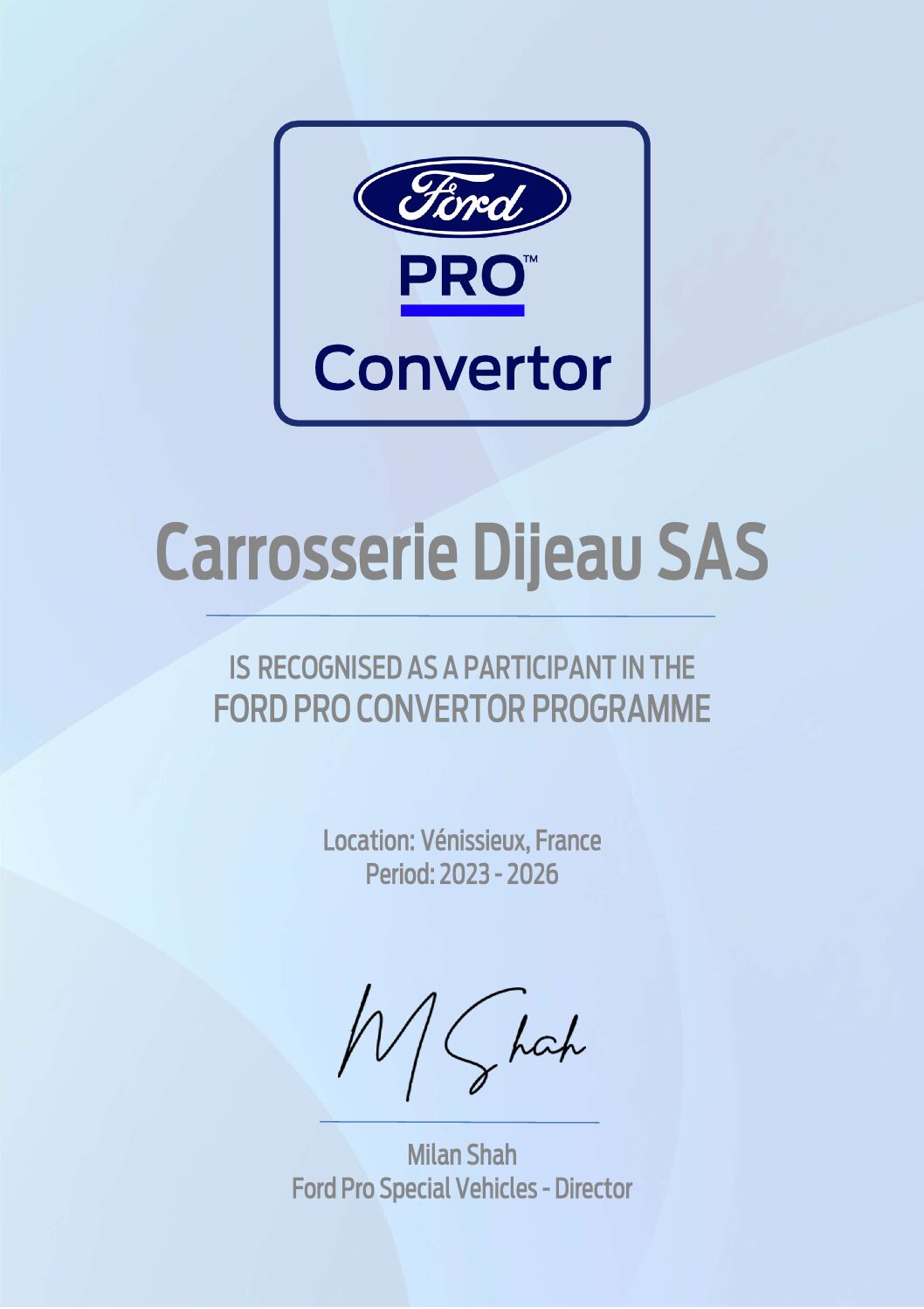 Dijeau Adaptations, dans le cadre de sa politique OEM a réussi avec succès son intégration au programme QVM de Ford Europe . Ci-après notre certificat FORD PRO CONVERTOR.
